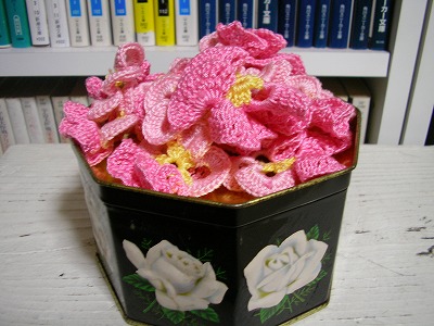 お花をあと2個編んでつなげて仕上げすれば完成や~~ん。