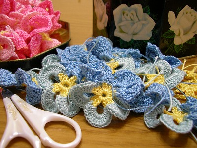 パンジーのお花を14個まで編んで、ドイリー部分も編めててん。