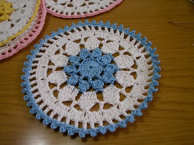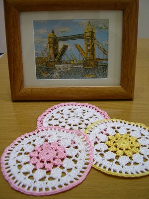 3枚編んだうちの奥のコースターは、「24」を観ながら編み始めて