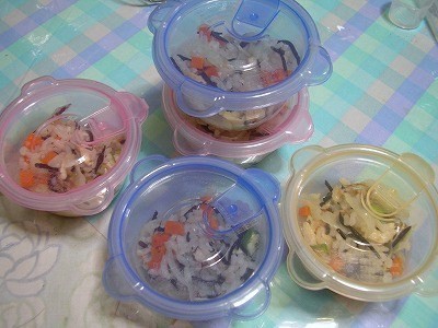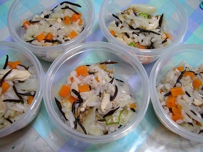 白ご飯・ひじき・キャベツ・ニンジン・鶏むね肉(茹でてあったから最後の方に投入)・オクラ。